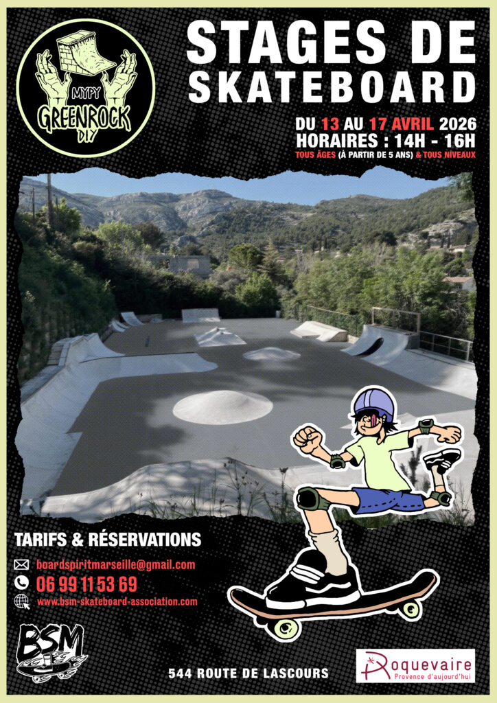 – Skateboard du 13 au 17 avril, de 14h à 16h, sur le Skate Park (route de Lascours), à partir de 5 ans, tous niveaux : 120 € la semaine, matériel fourni (planche, casque, protections). Infos, inscription : 06.99.11.53.69 – boardspiritmarseille@gmail.com