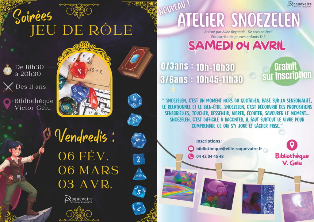 - Vendredi 3 avril : Soirée “Jeu de Rôle”, de 18h30 à 20h30. Dès 11 ans. Venez incarner un personnage en le faisant évoluer dans un monde imaginaire.