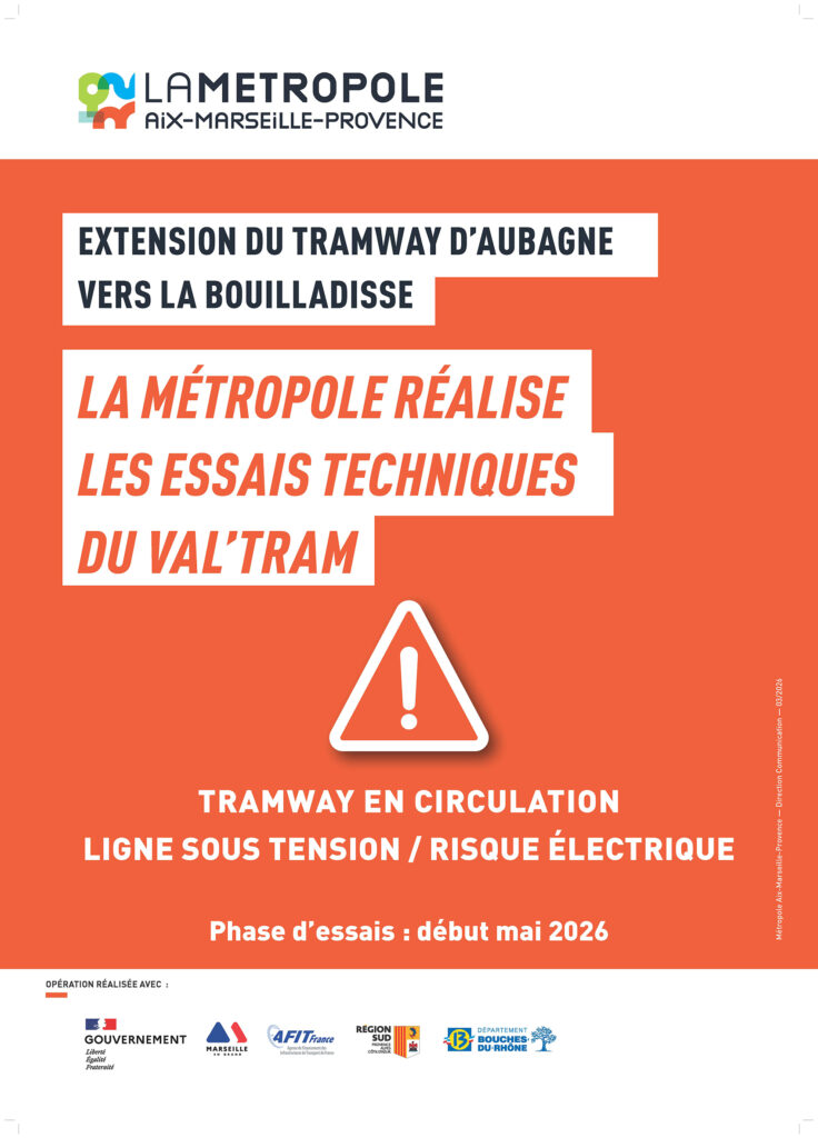 Le Val’Tram va prochainement entrer dans la phase « essais » sur l’ensemble de sa ligne entre Aubagne et La Bouilladisse avec la mise sous tension 750 V (nuit du 5 au 6 mai) et les premières circulations des rames d’essai le 12 mai.