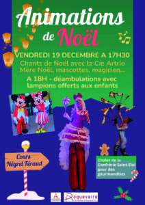 17h30 : Chants de Noël, Mère Noël, mascottes, Magicien en déambulation