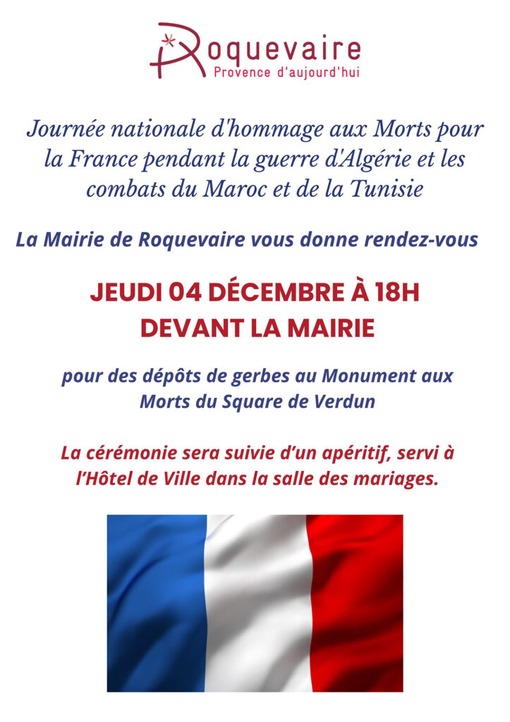 La Ville de Roquevaire vous donne rendez-vous devant la mairie à 18h pour un hommage aux Morts pour la France pendant la guerre d’Algérie, les combats du Maroc et de la Tunisie.