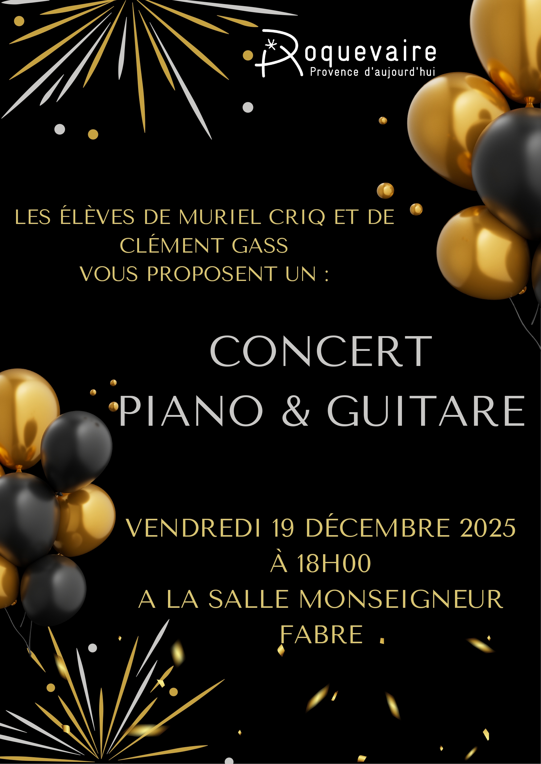 Salle Monseigneur Fabre 34 Avenue des Alliés, ROQUEVAIRE, FranceLes élèves de Muriel CRIQ et de Clément GASS vous proposent un concert piano–guitare. Venez nombreux partager ce moment musical...