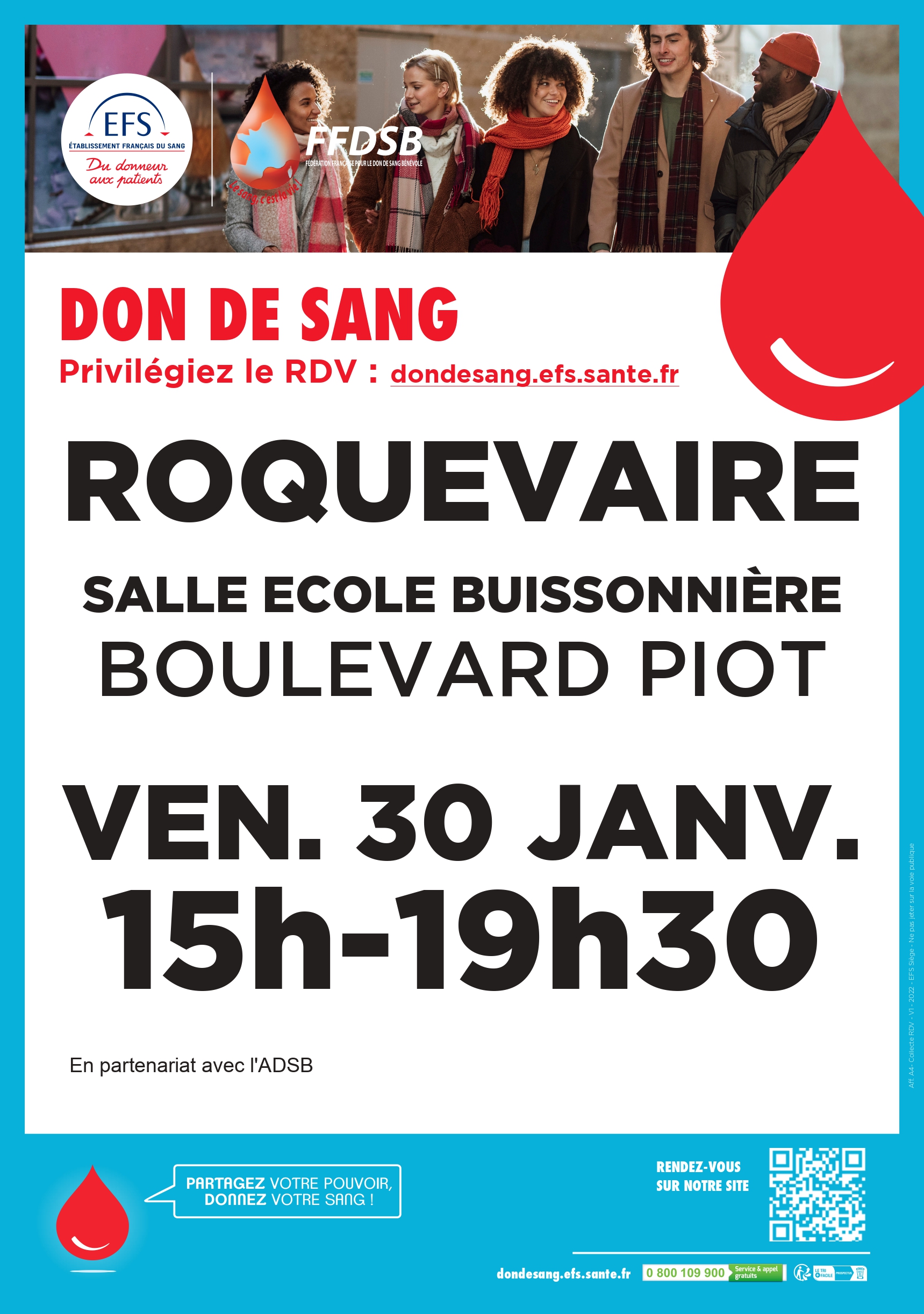 Don de sang Salle l’Ecole Buissonnière (bd Piot). Collecte organisée par l’Amicale pour le Don de Sang Bénévole (ADSB) de...