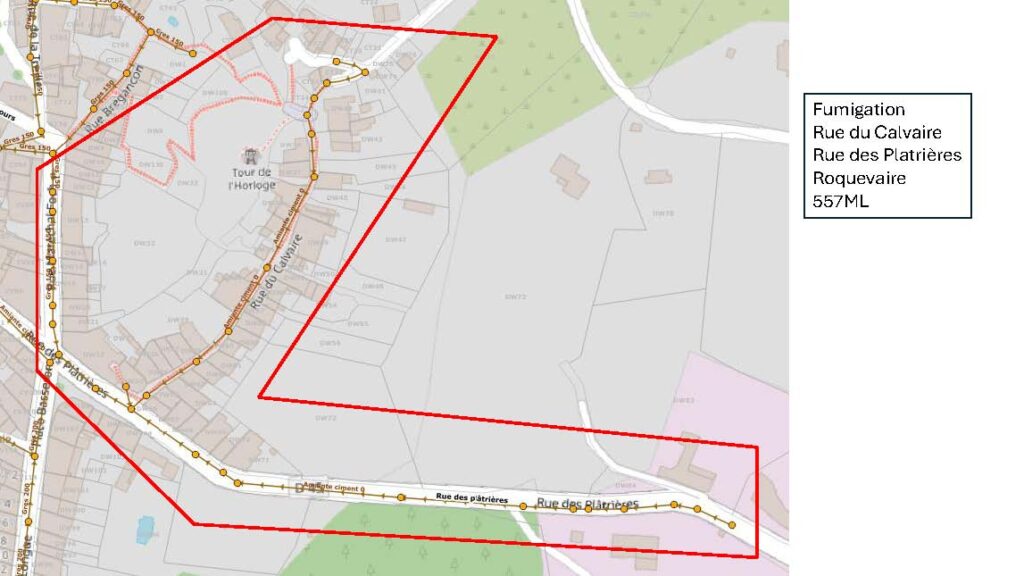 Cette intervention consiste à injecter une fumée blanche inodore non toxique dans le réseau d’assainissement afin de détecter d’éventuelles anomalies (mauvais raccordements, infiltrations d’eaux parasites, fissures…).