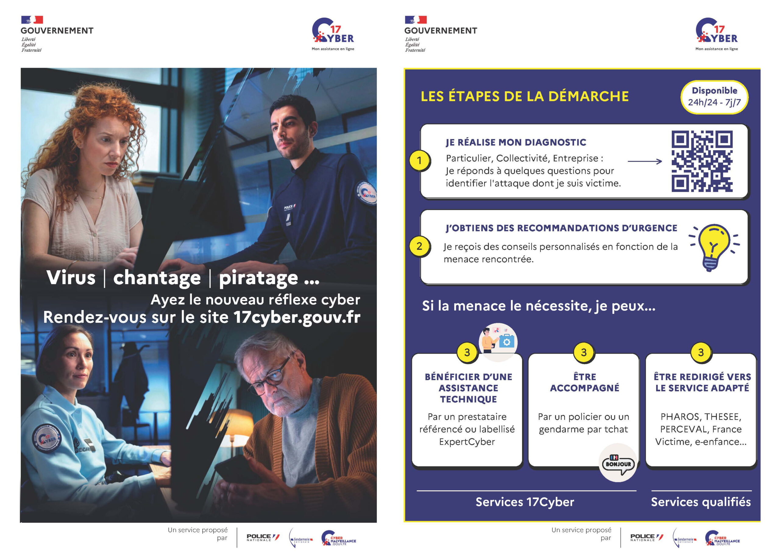 Vous pensez être victime d’un acte de malveillance en ligne (virus, hameçonnage, arnaque bancaire, sextorsion…) ? Le dispositif d’assistance 17Cyber est un outil de diagnostic en ligne qui vous permet d’obtenir une aide rapide à votre problème. Ce nouveau service propose des conseils personnalisés et, si nécessaire, de contacter directement, via un tchat, un gendarme ou un policier : https://17cyber.gouv.fr/