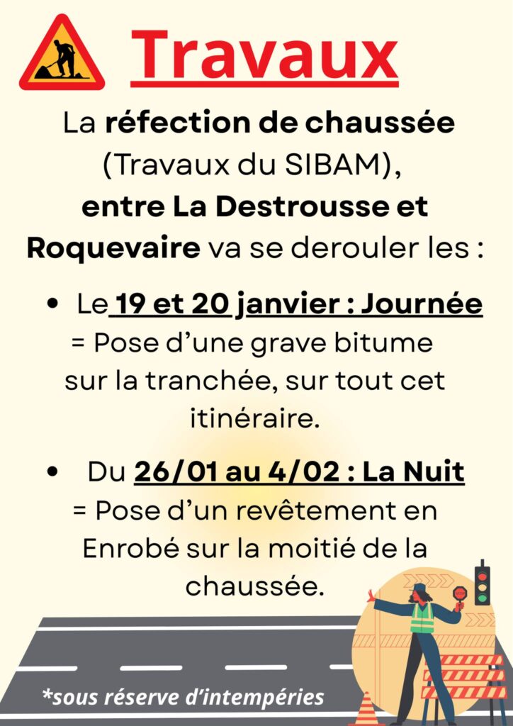 Circulation perturbée à prévoir entre Roquevaire et La Destrousse pour la réfection de la chaussée liée au travaux du SIBAM, entre La Destrousse et Roquevaire, durant les jours/nuits suivants :