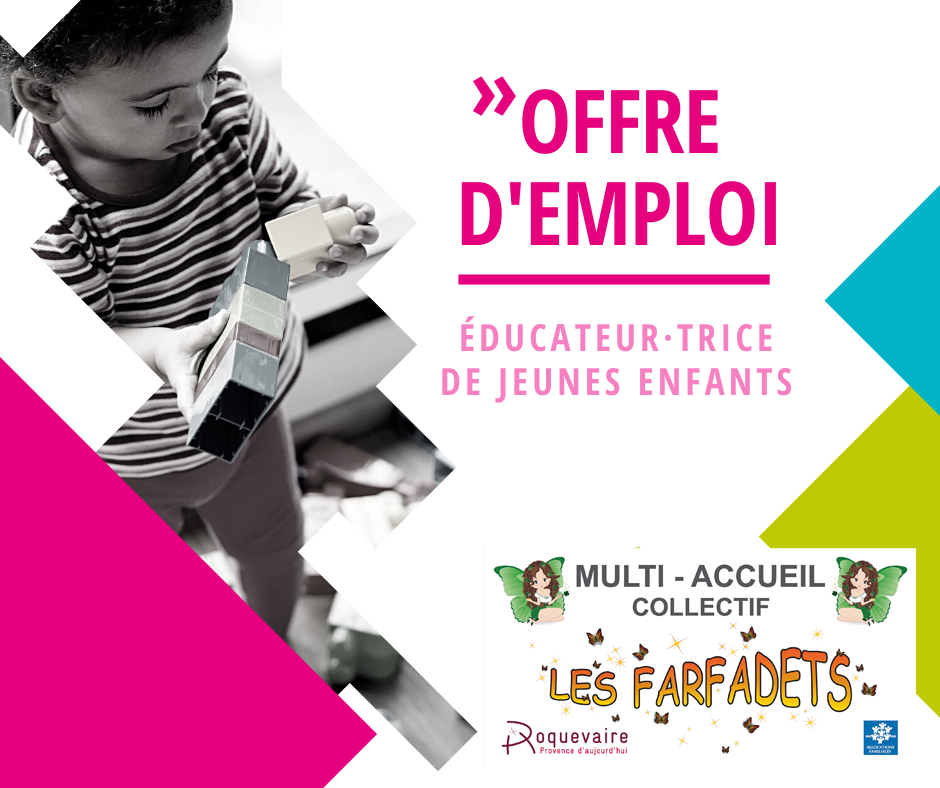 La crèche multi accueil collectif « Les Farfadets », située quartier St Roch à Roquevaire, recrute un(e) EDUCATRICE DE JEUNES ENFANTS (EJE) à temps plein – horaires tournants selon ouverture de la crèche.